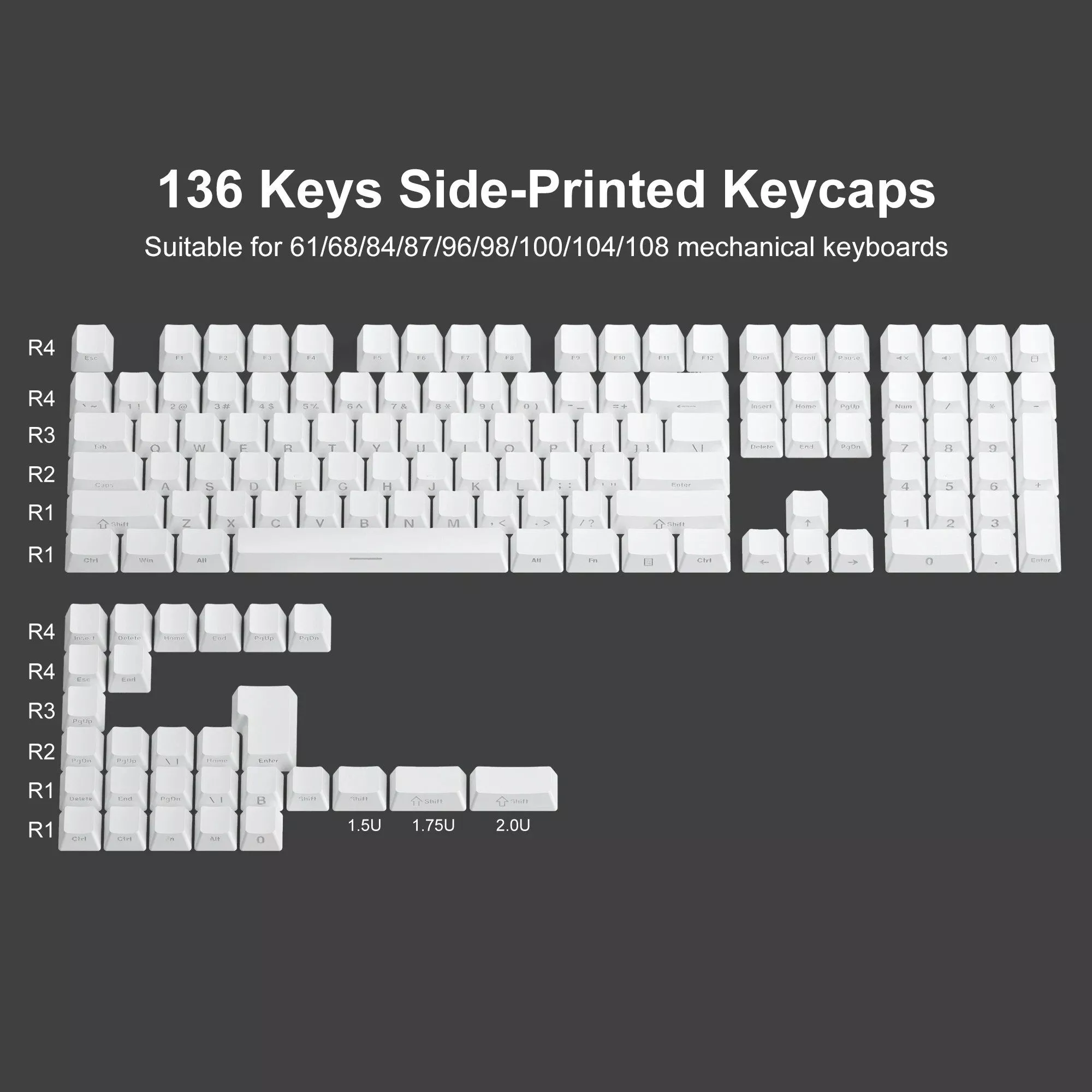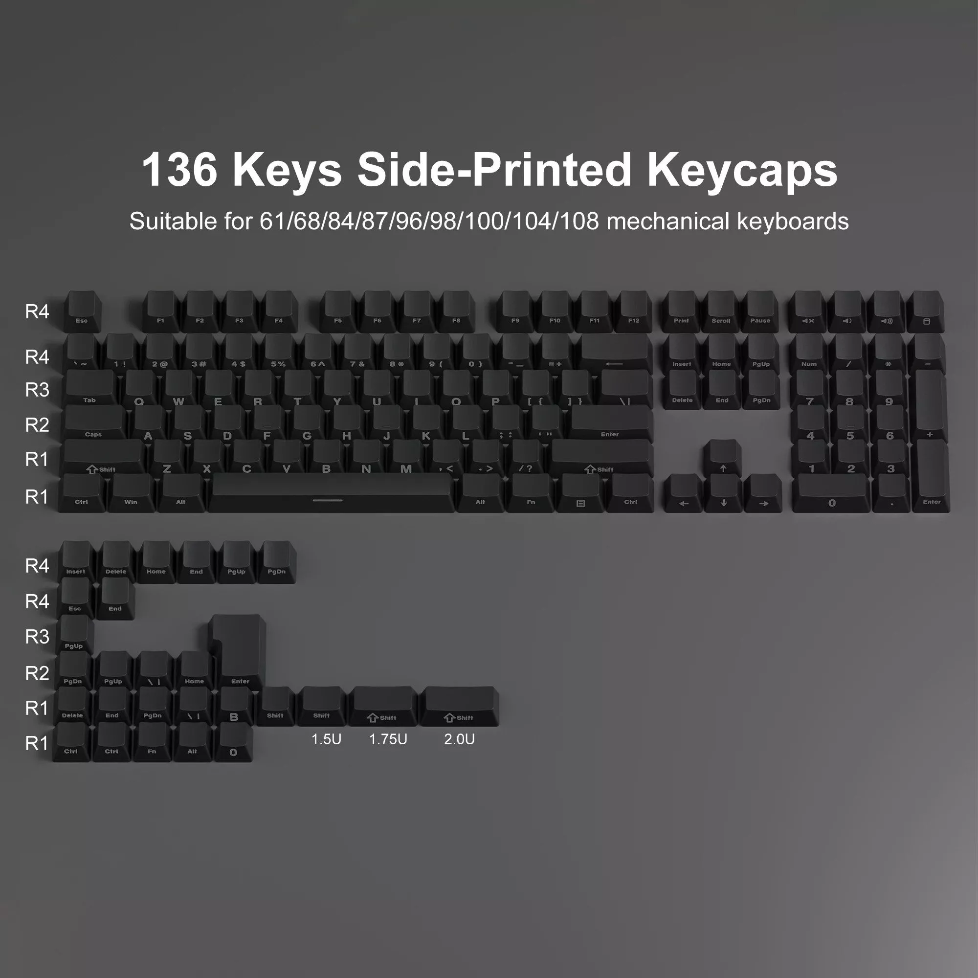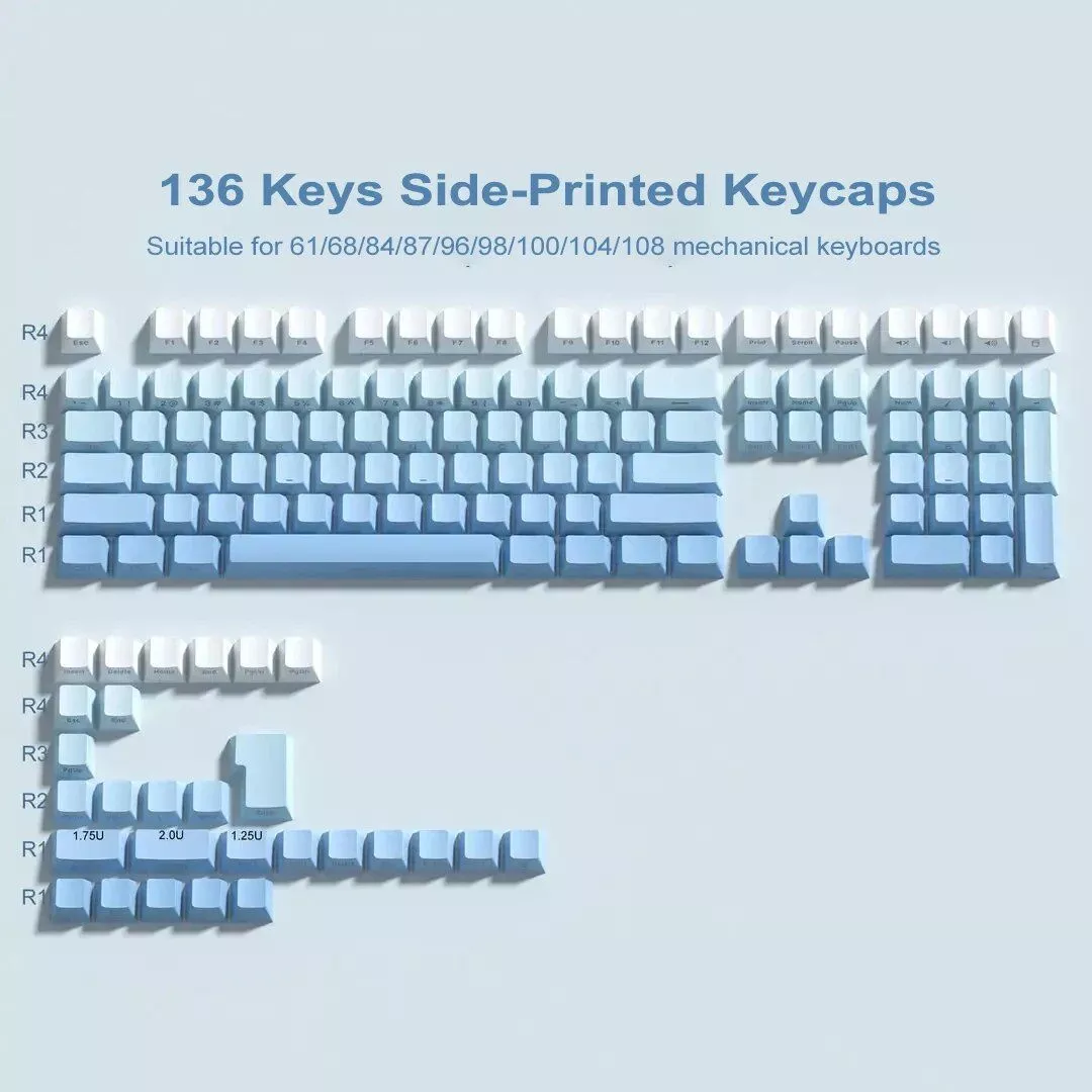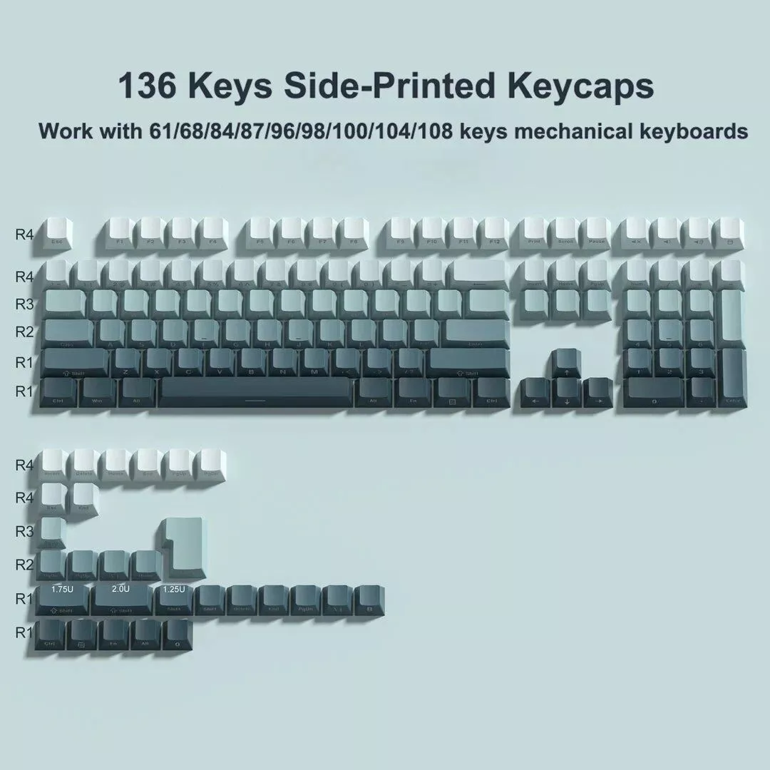 Our keycaps are crafted from high-quality PBT plastic, known for its durability and resistance to wear and shine. The double shot printing method ensures the legends never fade, maintaining a crisp, clear appearance through extensive use. With an OEM profile, these keycaps offer a comfortable typing experience, making them suitable for both gaming and professional environments. The side-printed legends, combined with a unique backlit design, create an elegant and understated look that stands out in any keyboard setup.