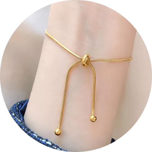 Jewellery main material: titanium. Shape: round adjustable bracelet/anklet. Color: gold.