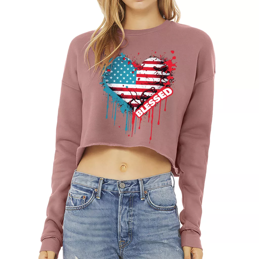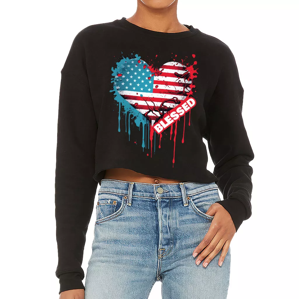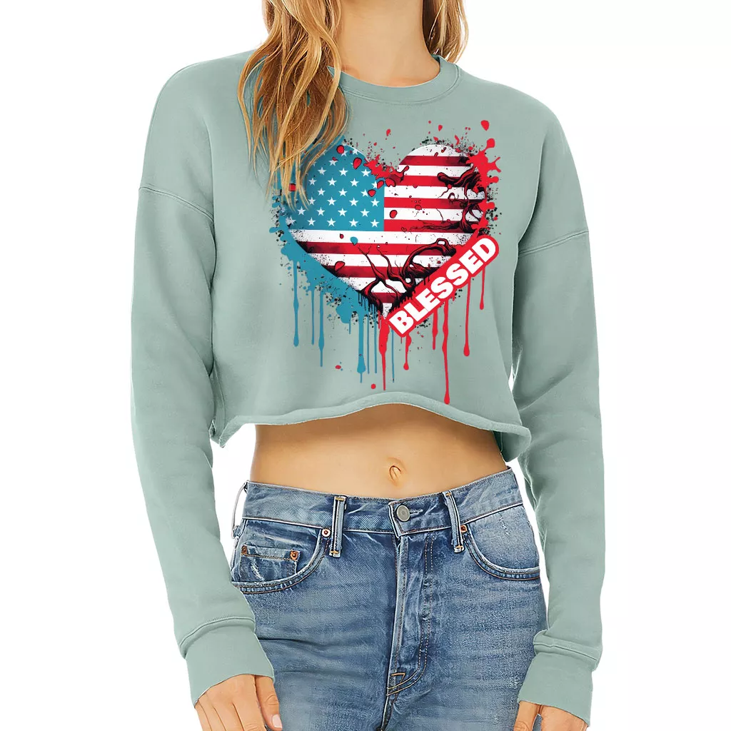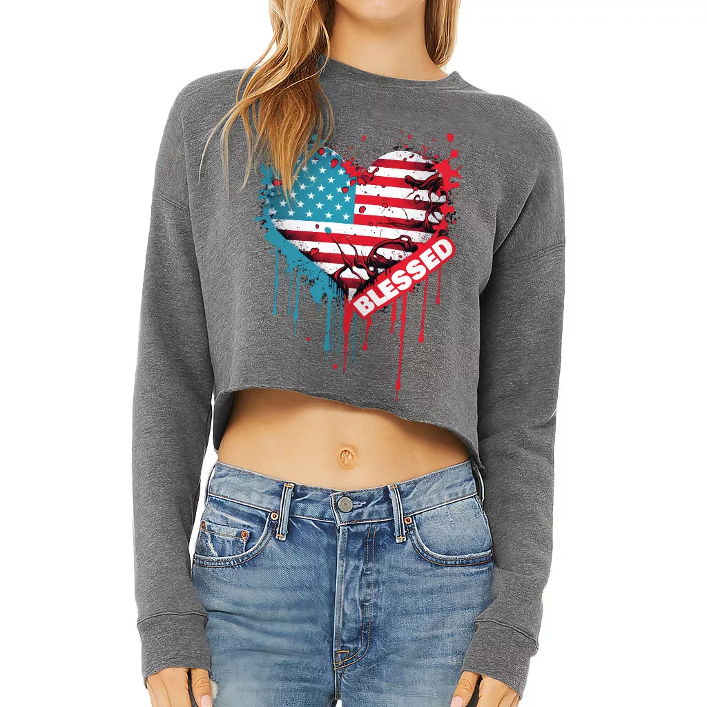 American Flag Cropped Sweatshirt – Blessed Women’s Sweatshirt – Heart Crop Crew Sweatshirt