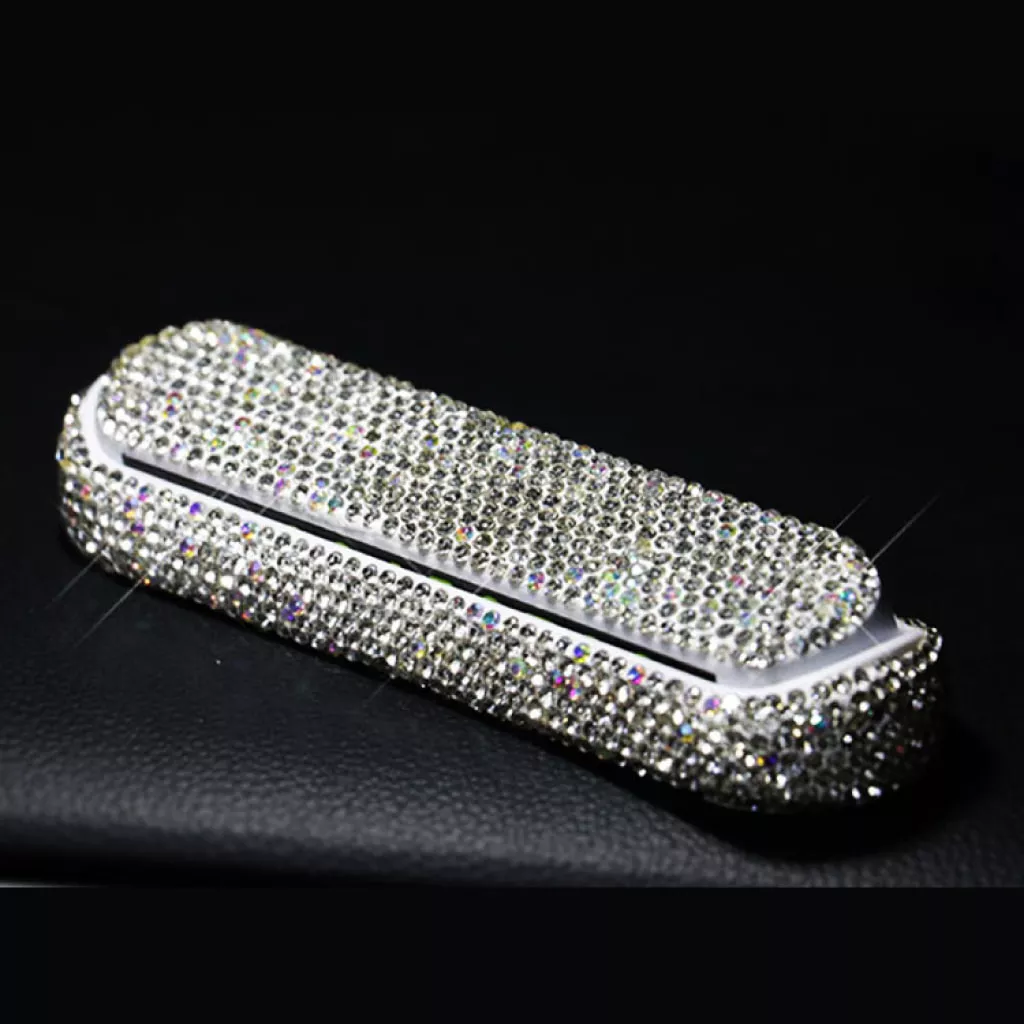 Bright rhinestones adorn this sleek and smart accessory for a touch of girly glam to your ride interior.
