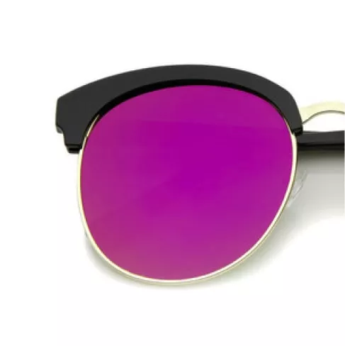 A half-frame design houses two bright magenta lenses that are all held together by a gold frame. The horn-rimmed design merges old school with modern for a new-age look to any outfit.