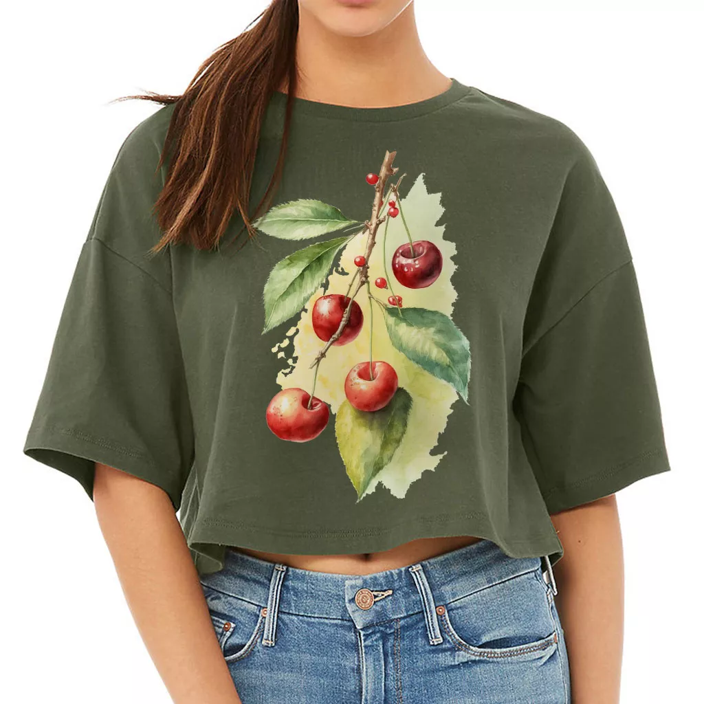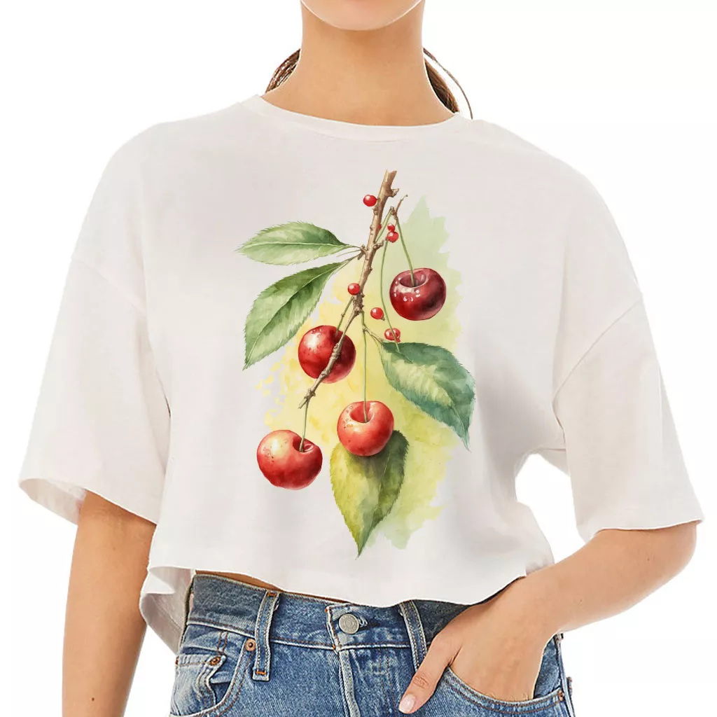 Cherry Print Women’s Crop Tee Shirt – Cute Cropped T-Shirt – Themed Crop Top