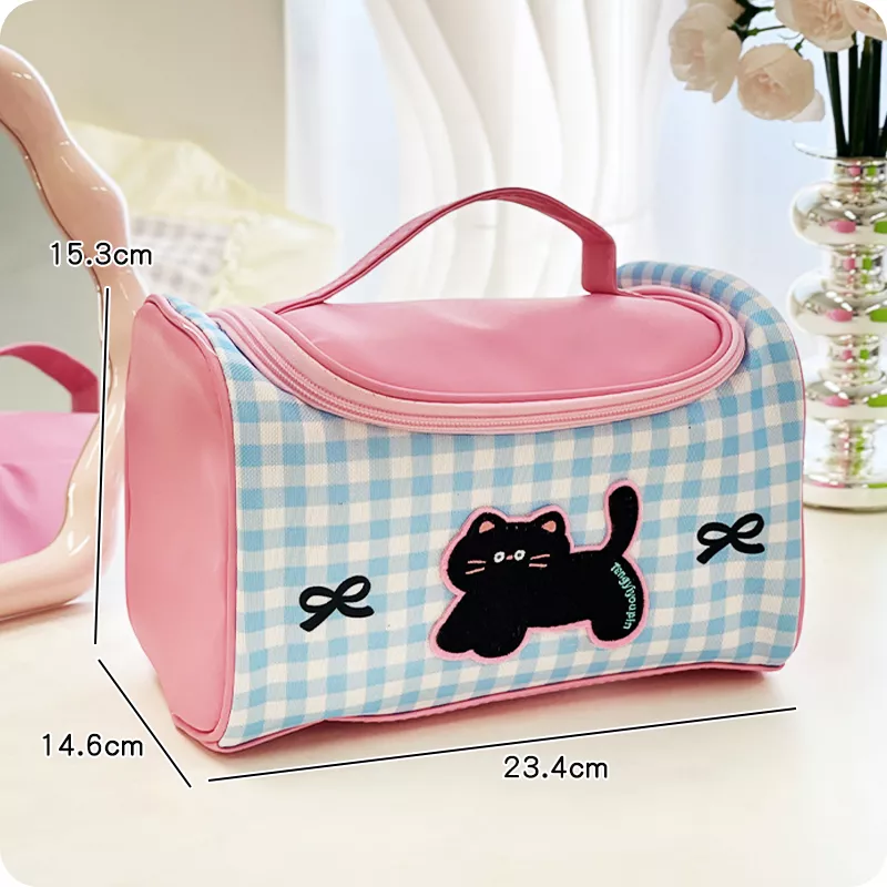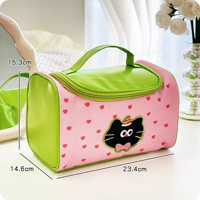 Made from durable, eco-friendly canvas fabric, this portable cosmetic bag offers a spacious interior with a thoughtful layout to help you stay organized. It is available in two adorable colors—pink and green—each featuring a cute cartoon design of either a cat or a dog to add a playful touch to your travel accessories. With a waterproof exterior, it keeps your products dry and protected, while the foldable design makes it easy to store in your luggage or bag when not in use.