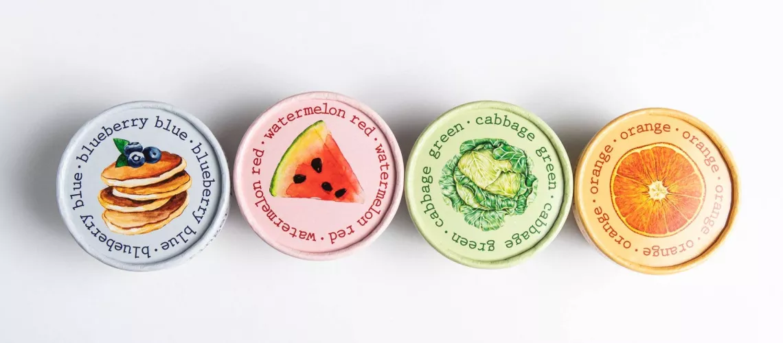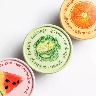 Includes 4 colors: blueberry blue, cabbage green, watermelon red, and orange… well, orange! The bright, vibrant colors can be mixed to create new shades.