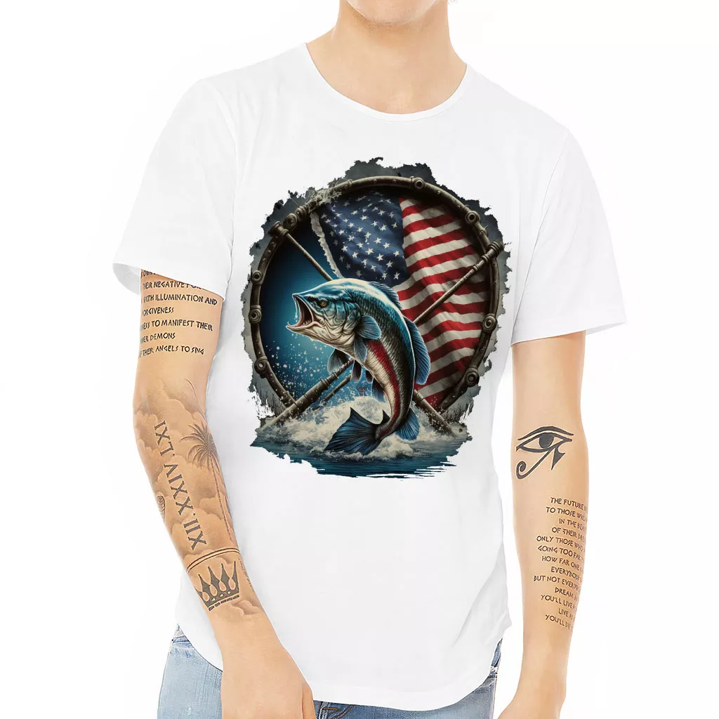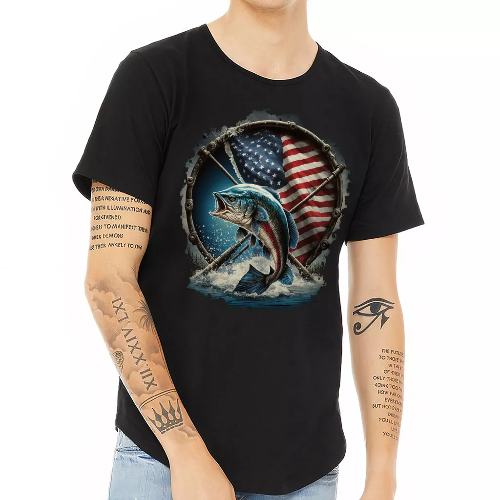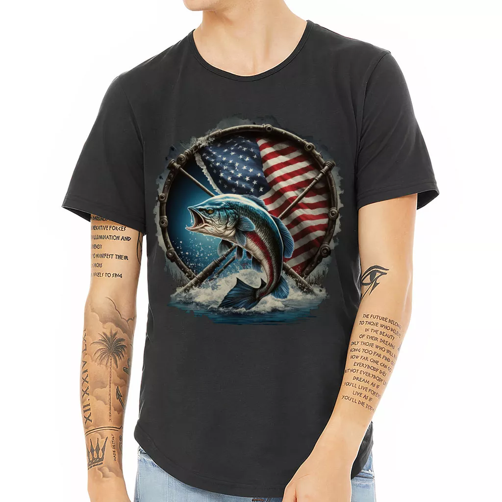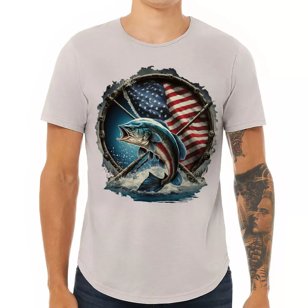 Flag Behind Bass Fishing Curved Hem T-Shirt – Patriotic T-Shirt – Cool Curved Hem Tee