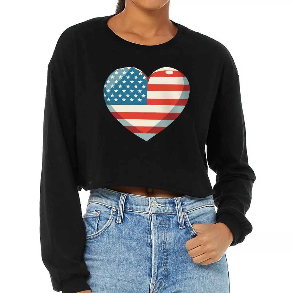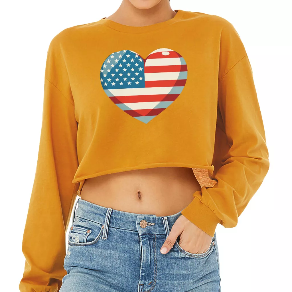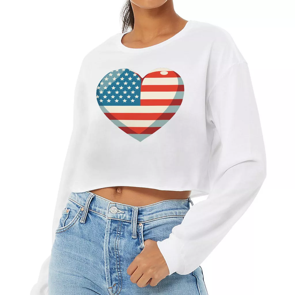 Flag Heart Cropped Long Sleeve T-Shirt – USA Flag Women’s T-Shirt – Patriotic Long Sleeve Tee