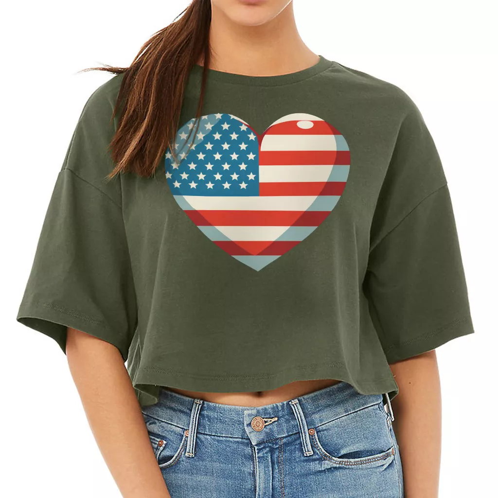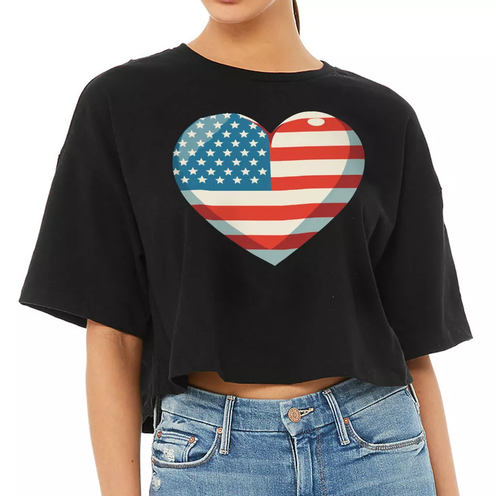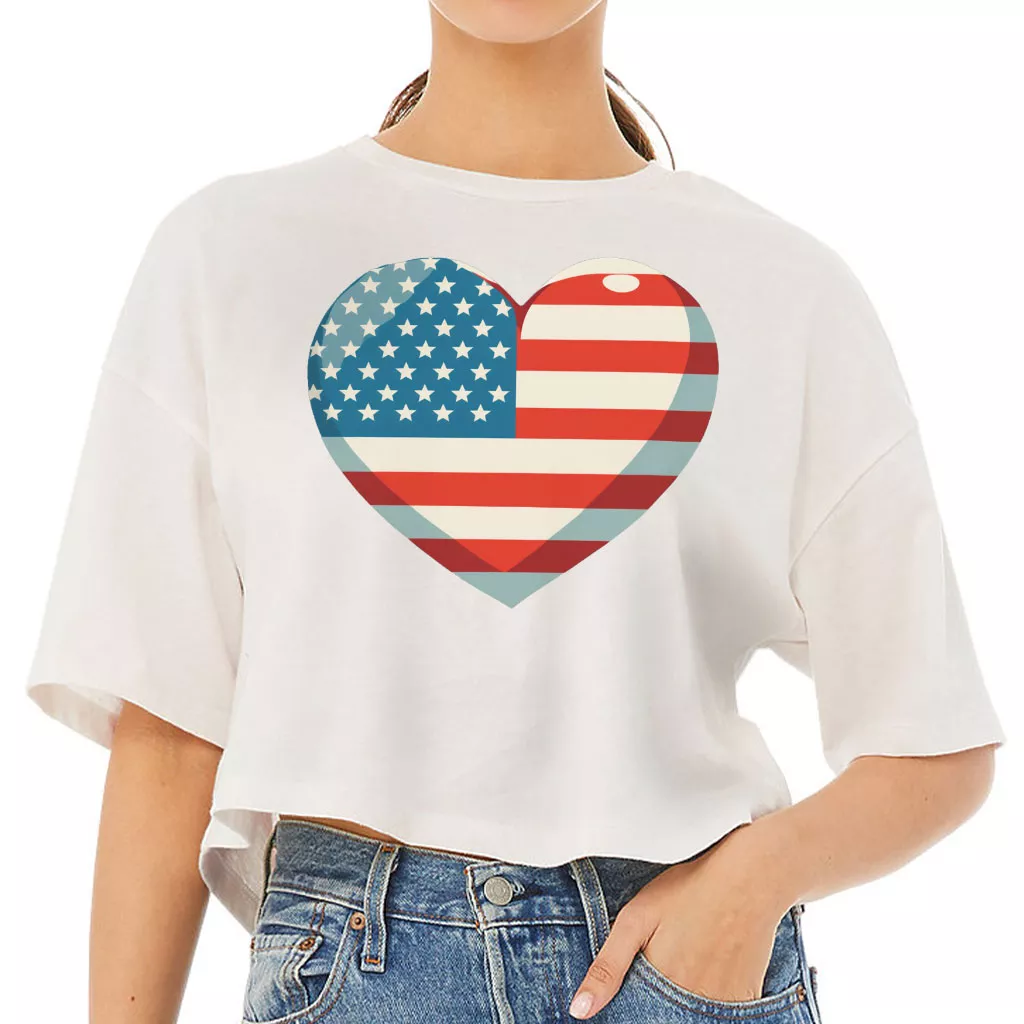 Flag Heart Women’s Crop Tee Shirt – USA Flag Cropped T-Shirt – Patriotic Crop Top