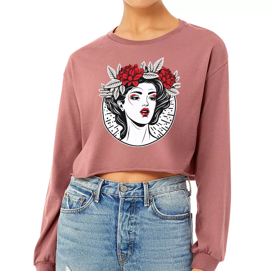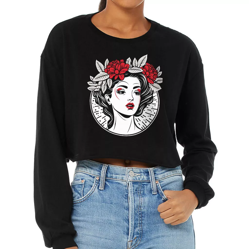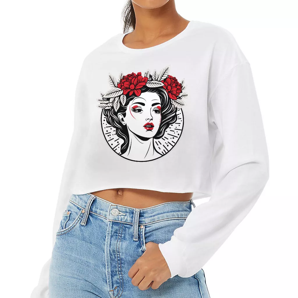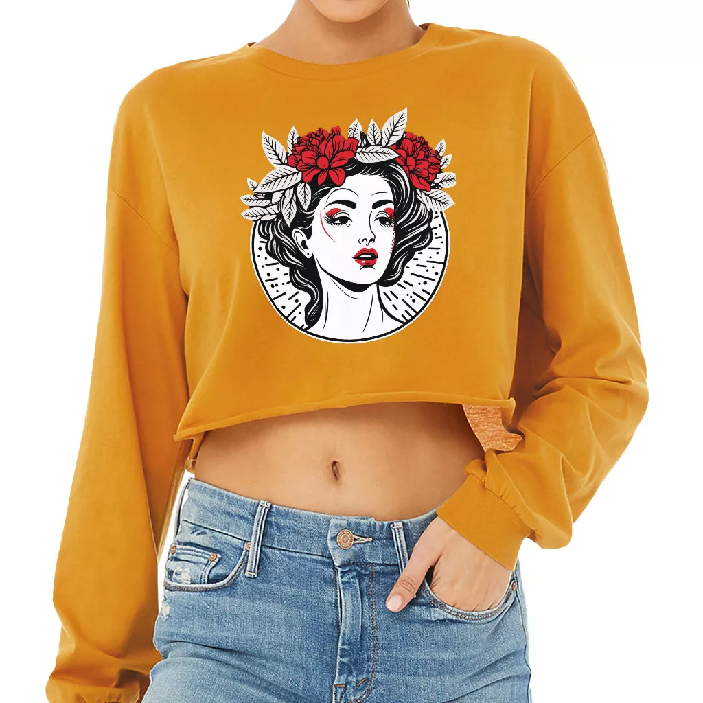 Floral Design Cropped Long Sleeve T-Shirt – Cool Graphic Women’s T-Shirt – Illustration Long Sleeve Tee