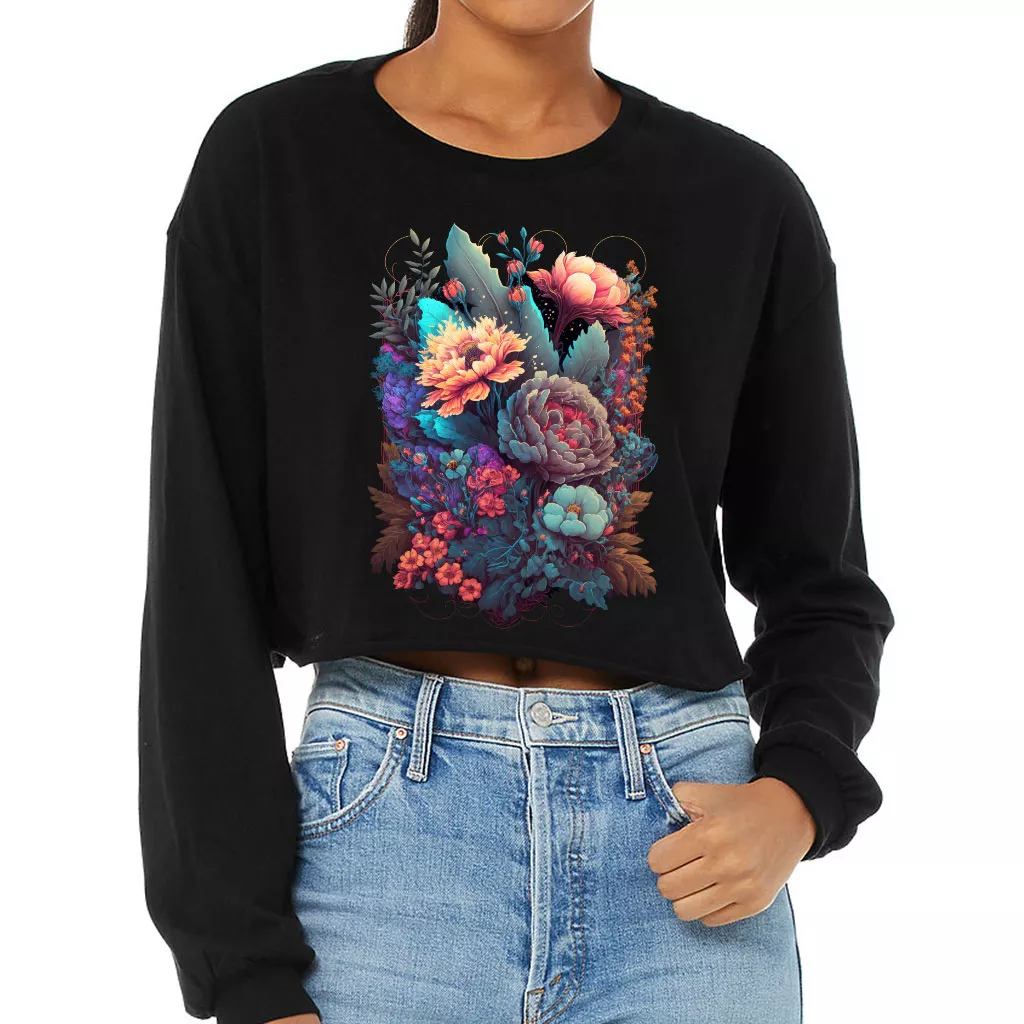 Flower Graphic Cropped Long Sleeve T-Shirt – Cute Women’s T-Shirt – Digital Art Long Sleeve Tee