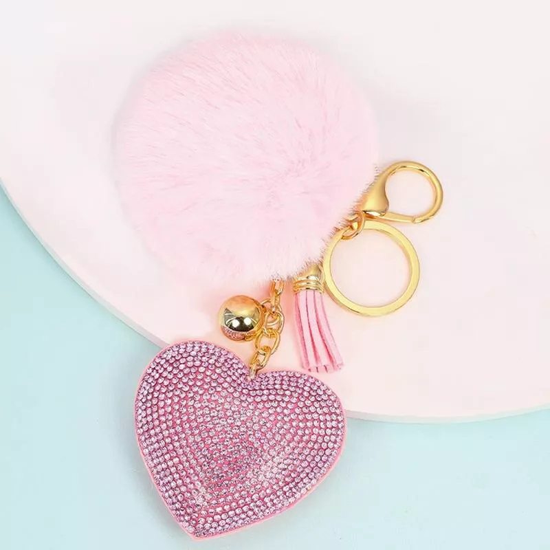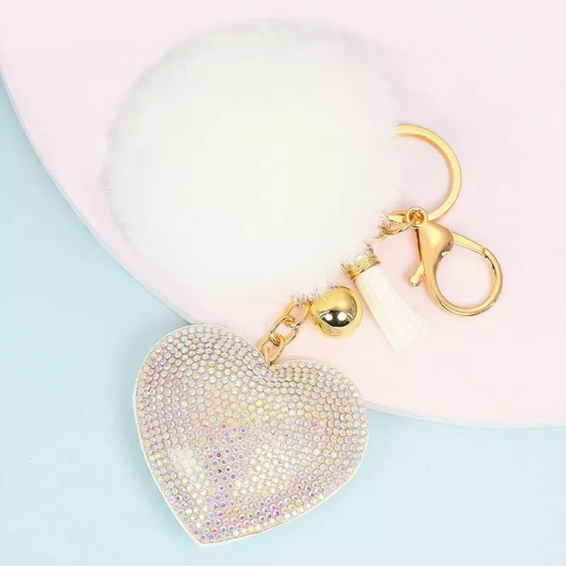Heart-Shaped Rhinestone & Plush Pom Pom Keychain