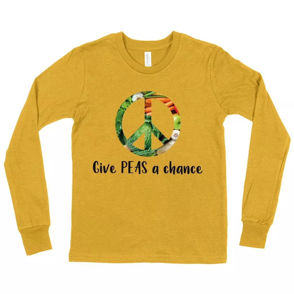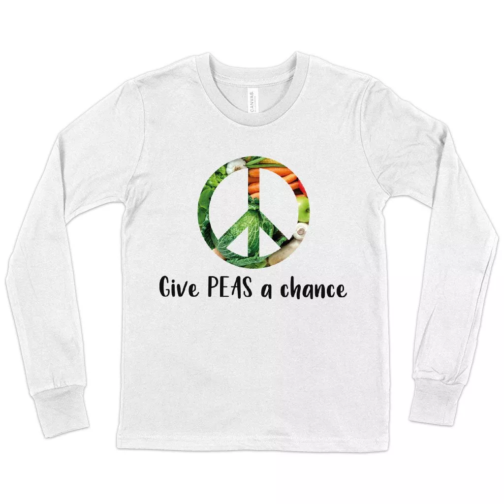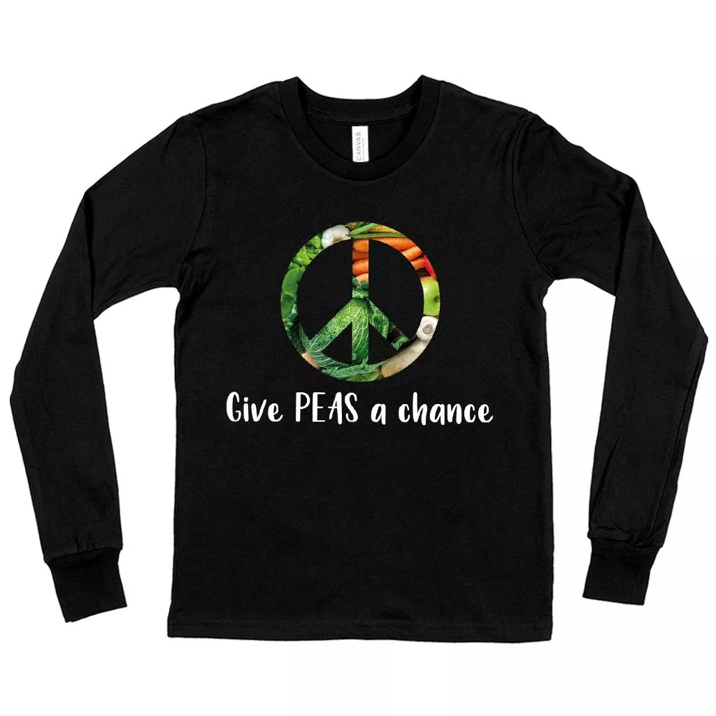 Kids’ Give Peas a Chance Funny Vegan Long Sleeve T-Shirt – Vegan Print T-Shirt – Vegetarian Funny T-Shirts