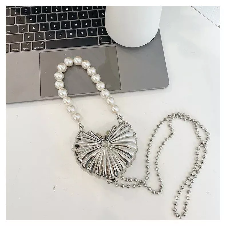 Luxury Pearl Beaded Metallic Heart Crossbody Bag