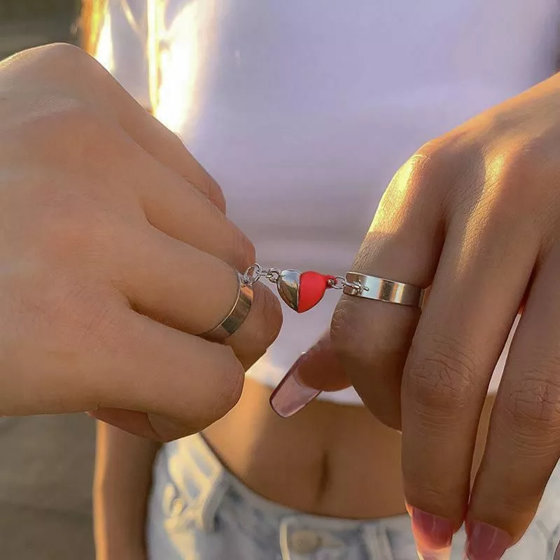 - Design: Trendy silver color with a unique magnetic heart charm that connects two rings.