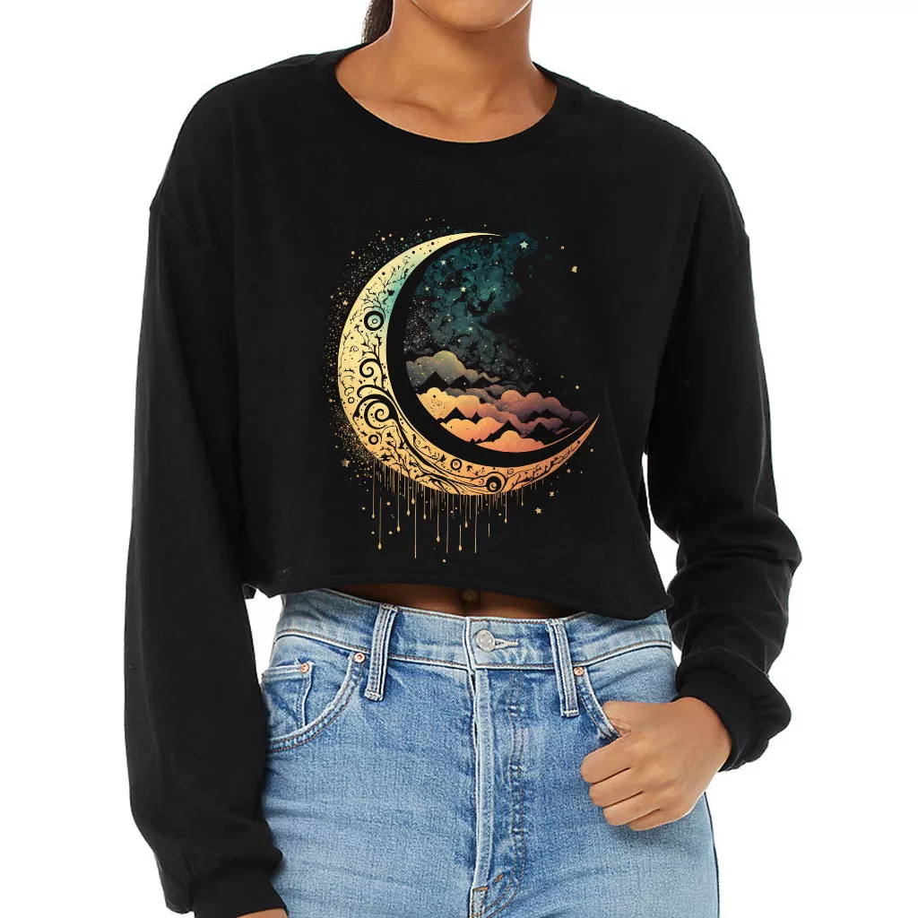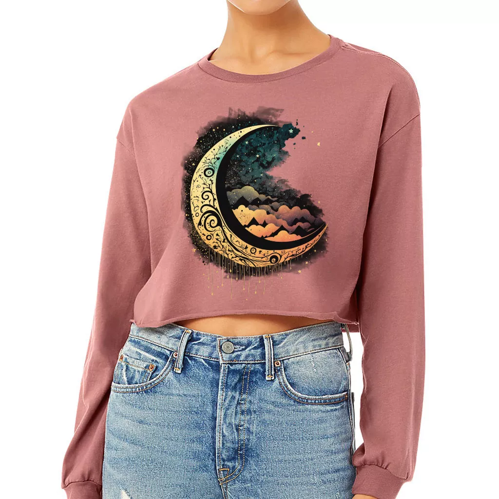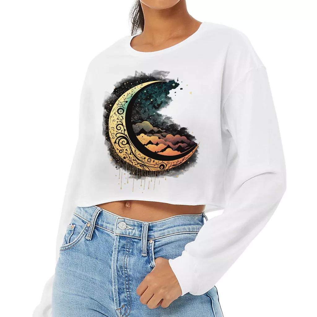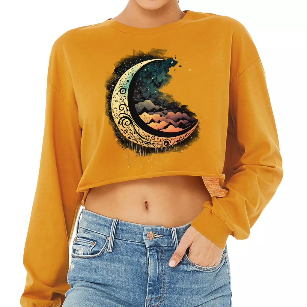 Moon Graphic Cropped Long Sleeve T-Shirt – Cool Art Women’s T-Shirt – Printed Long Sleeve Tee