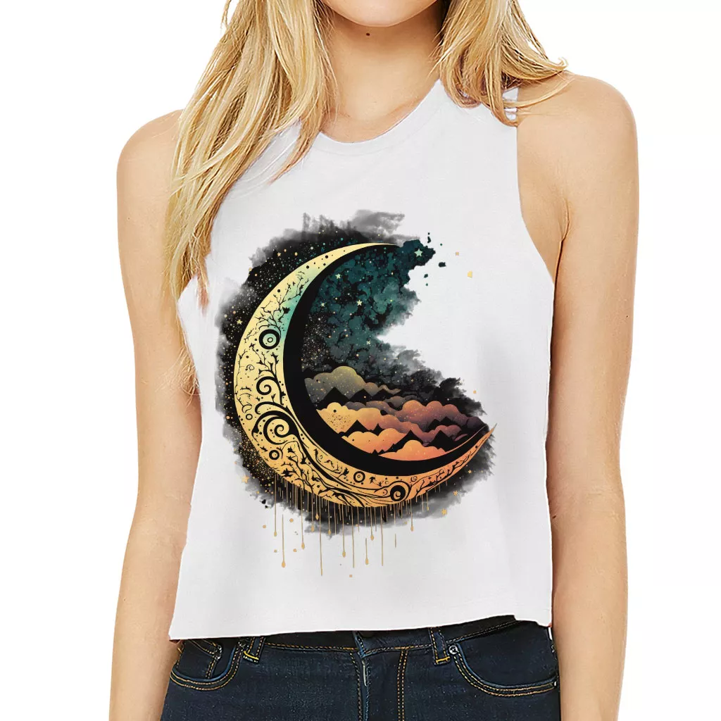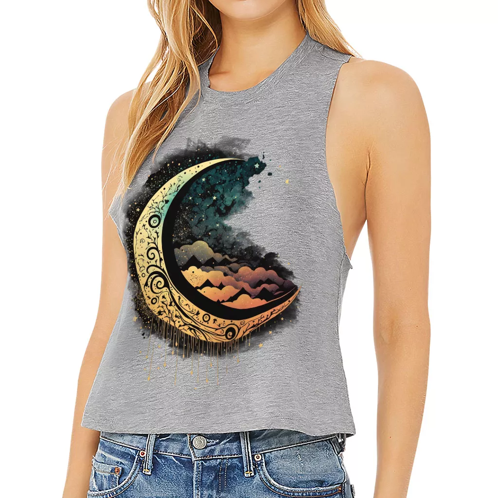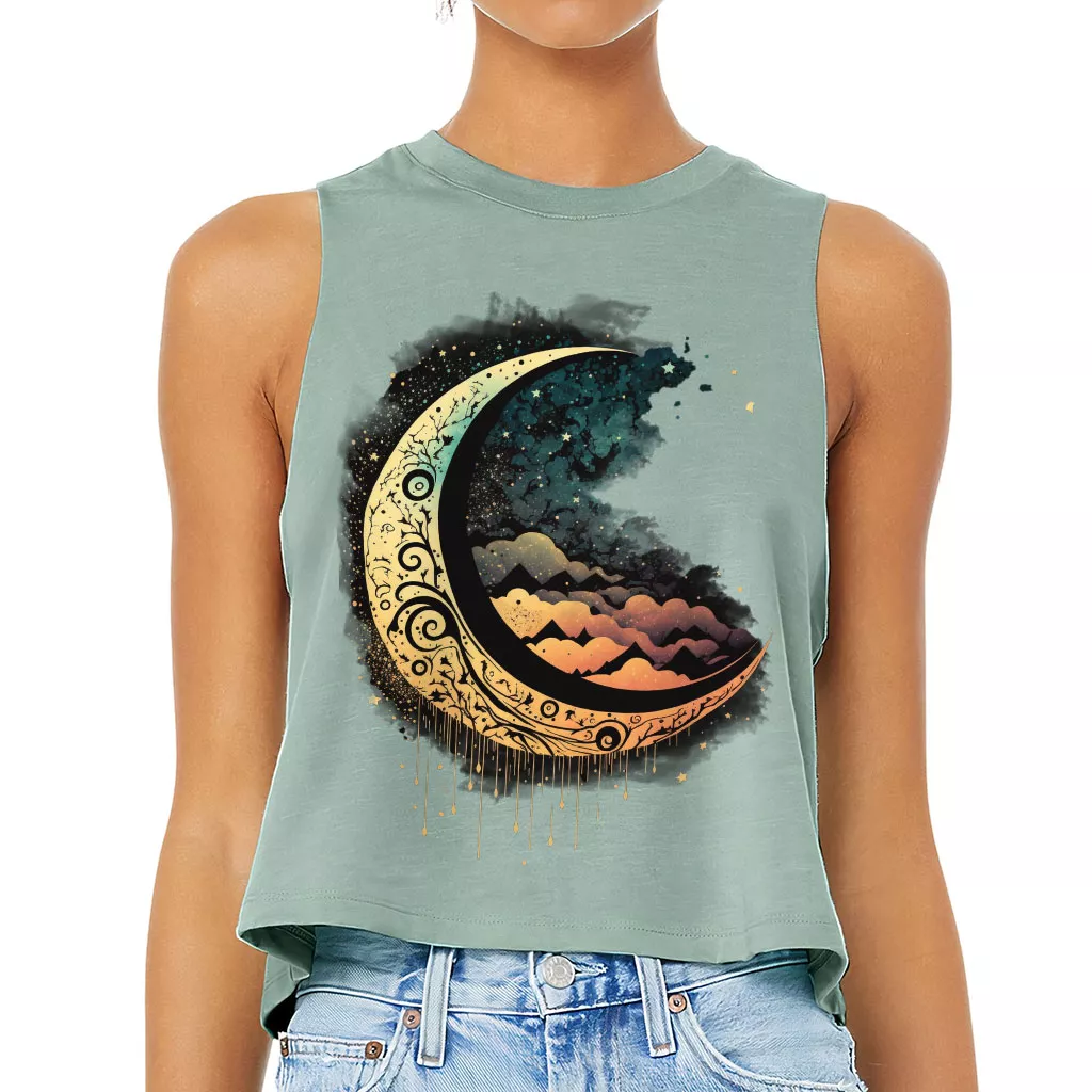 Moon Graphic Racerback Cropped Tank – Cool Art Women’s Tank – Printed Tank Top
