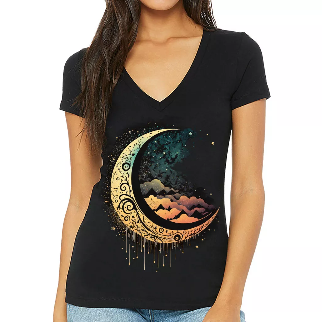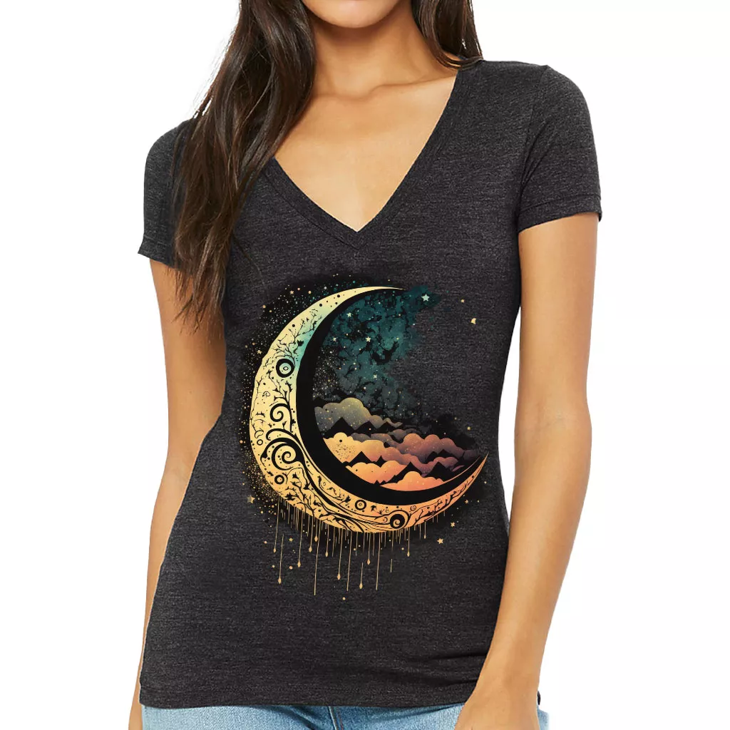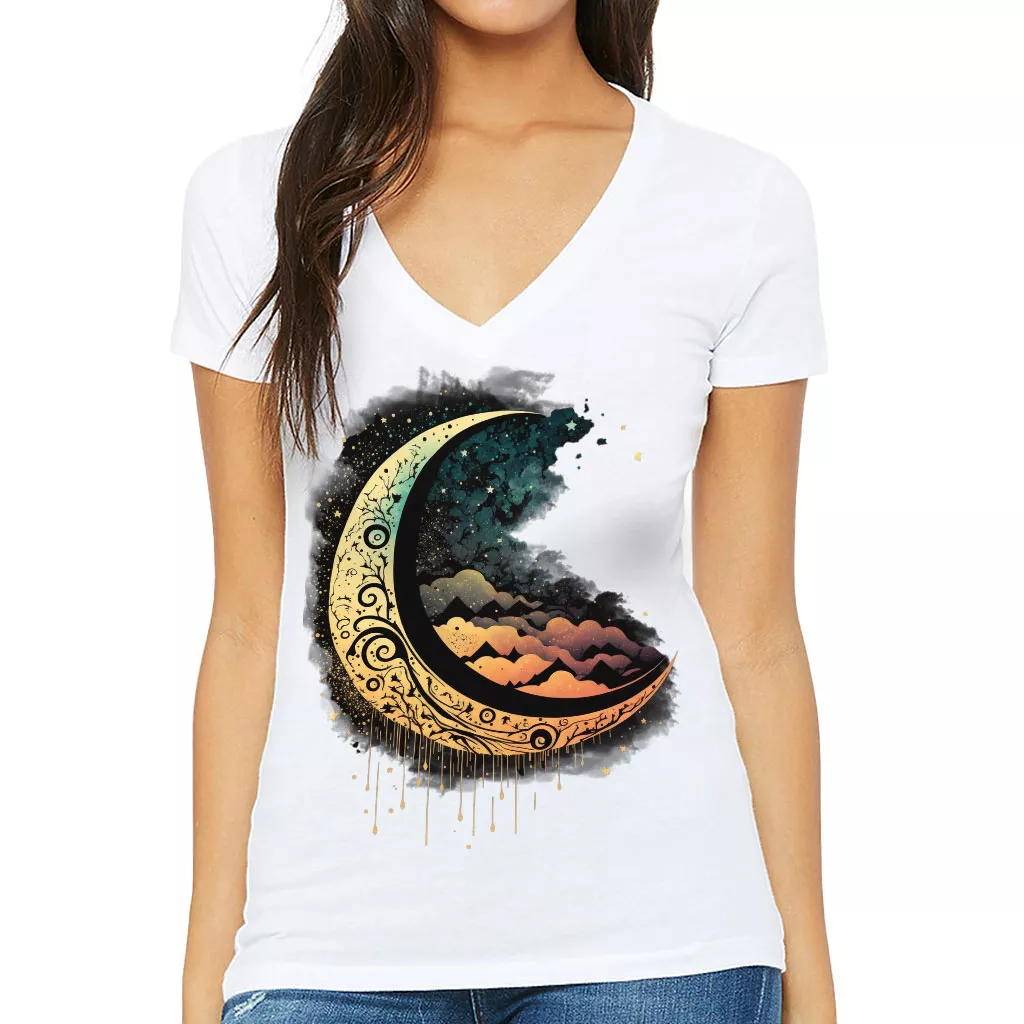 Moon Graphic Women’s V-Neck T-Shirt – Cool Art V-Neck Tee – Printed T-Shirt