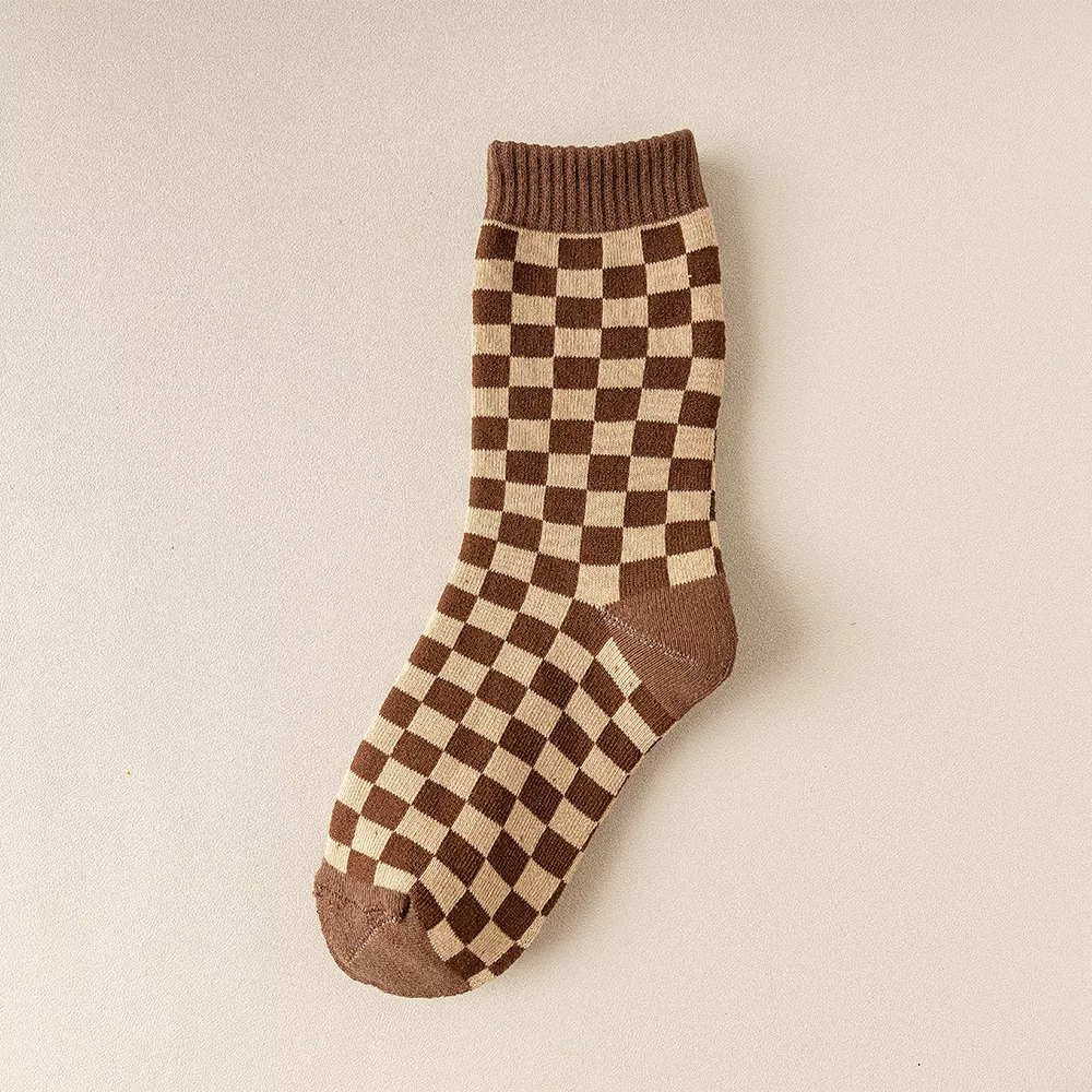 The intricate embroidery detailing adds a touch of elegance to the classic plaid pattern, making these socks not just functional but a chic accessory for any outfit. With a middle tube height, they provide just the right amount of coverage, keeping your feet cozy without feeling too bulky. The thick, terry cotton material makes them perfect for colder months, while still being breathable enough to wear through the changing seasons.