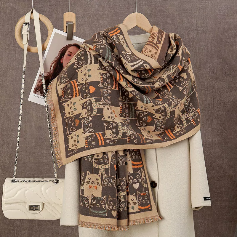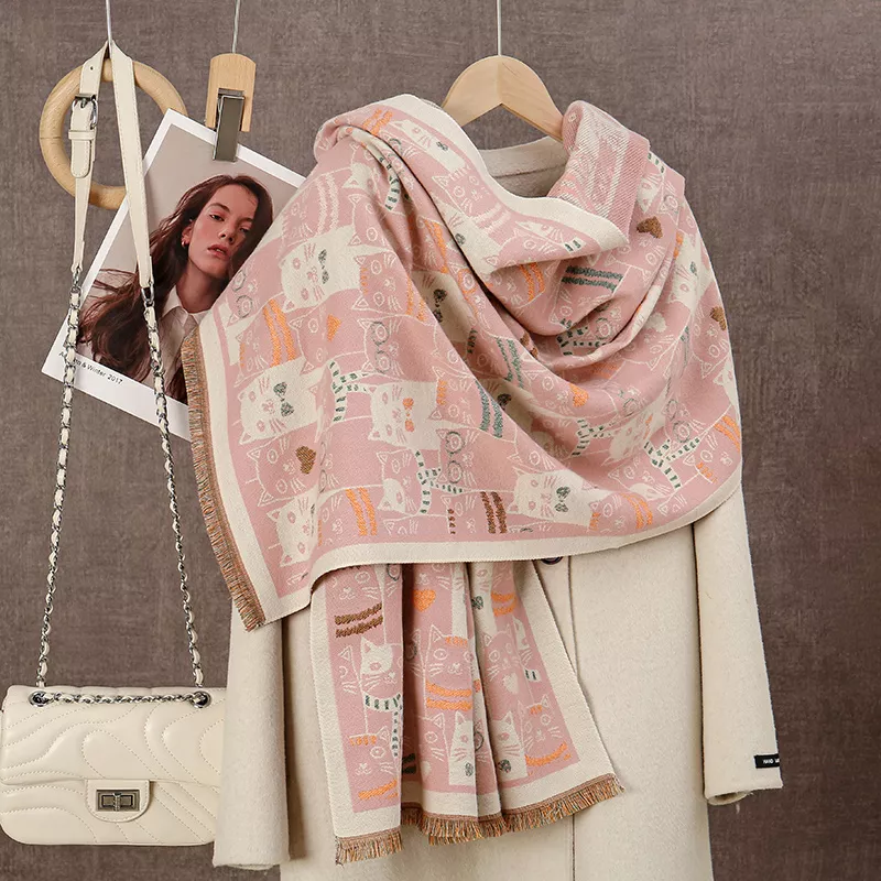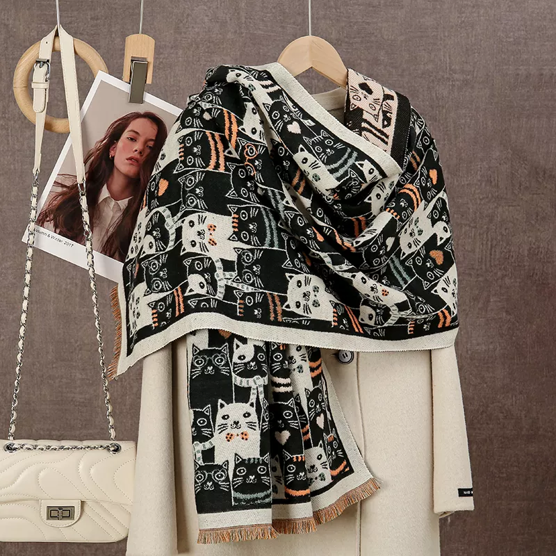 Women’s Winter Long Pashmina Shawl Scarf – Cartoon Cat Pattern Double-Sided Muffler